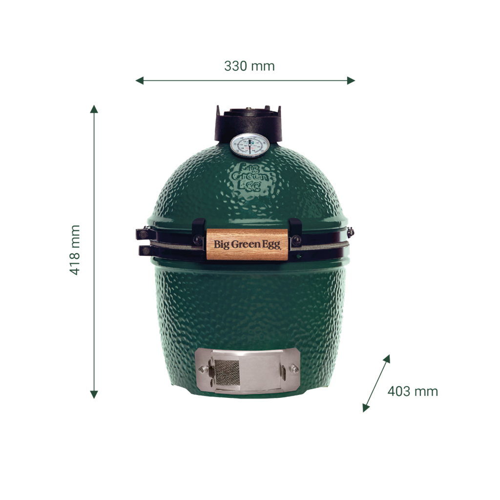 Това е най-малкият член на фамилията – Мини. Той е създаден специално, за да бъде с вас навсякъде, защото тежи само 17 кг. и можете спокойно да го взимате в колата, накъдето й да тръгнете. Много често, запалените EGG фенове, които имат някой от по-големите модели, си купуват Mini, защото не искат да се разделят с барбекюто си по време на пътуване.