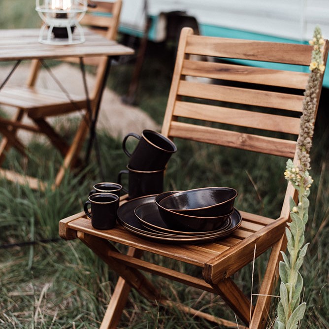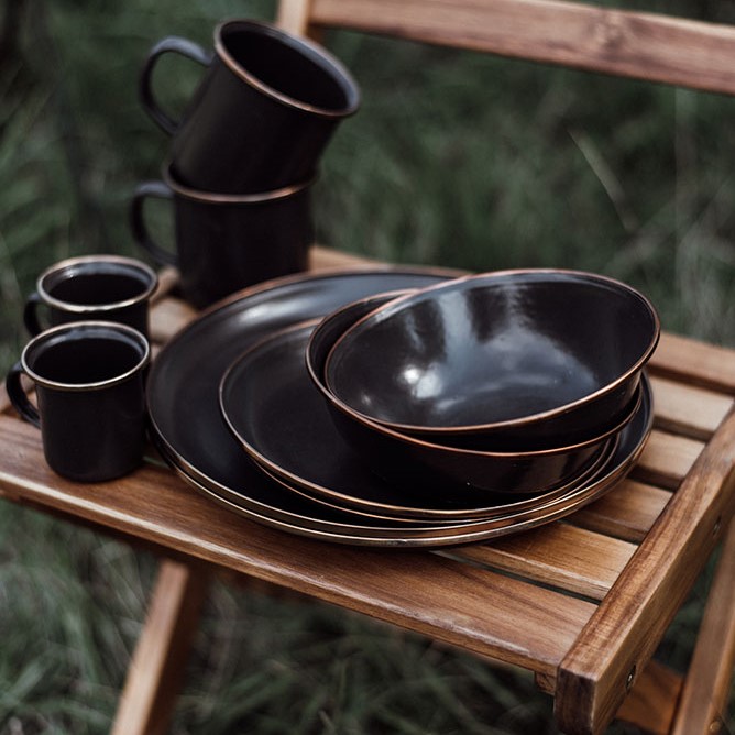 Емайлираните комплекти от съдове за хранене на BAREBONES са перфектни за създаване на запомнящи се преживявания, независимо дали се наслаждавате на небрежна почивка с чаша чай или организирате по-елегантно вечерно събиране на открито. Красивото съчетание от функционалност и стил прави съдовете идеален избор както за ежедневна употреба, така и за специални случаи. Всеки артикул разполага с ръчно завършен изпечен бронзов кант от неръждаема стомана, създаващ красив патиниран завършек.