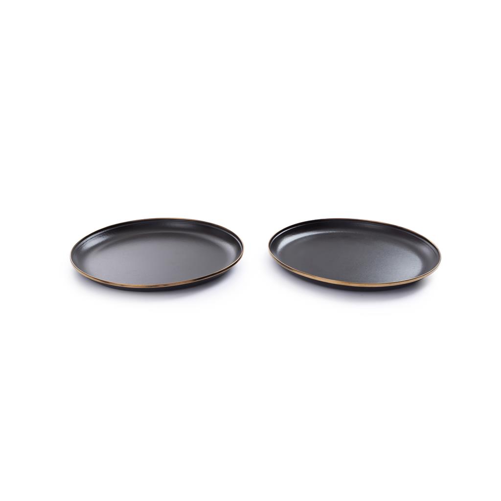 Всеки артикул е изработен от неръждаема стомана с текстурирана шарка на петна. Завършен е с ръчно изработен изпечен бронзов кант от неръждаема стомана, създаващ красив патиниран ефект.