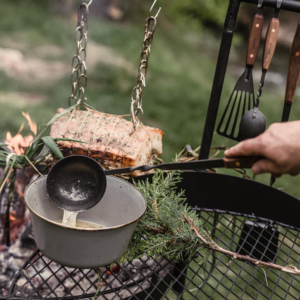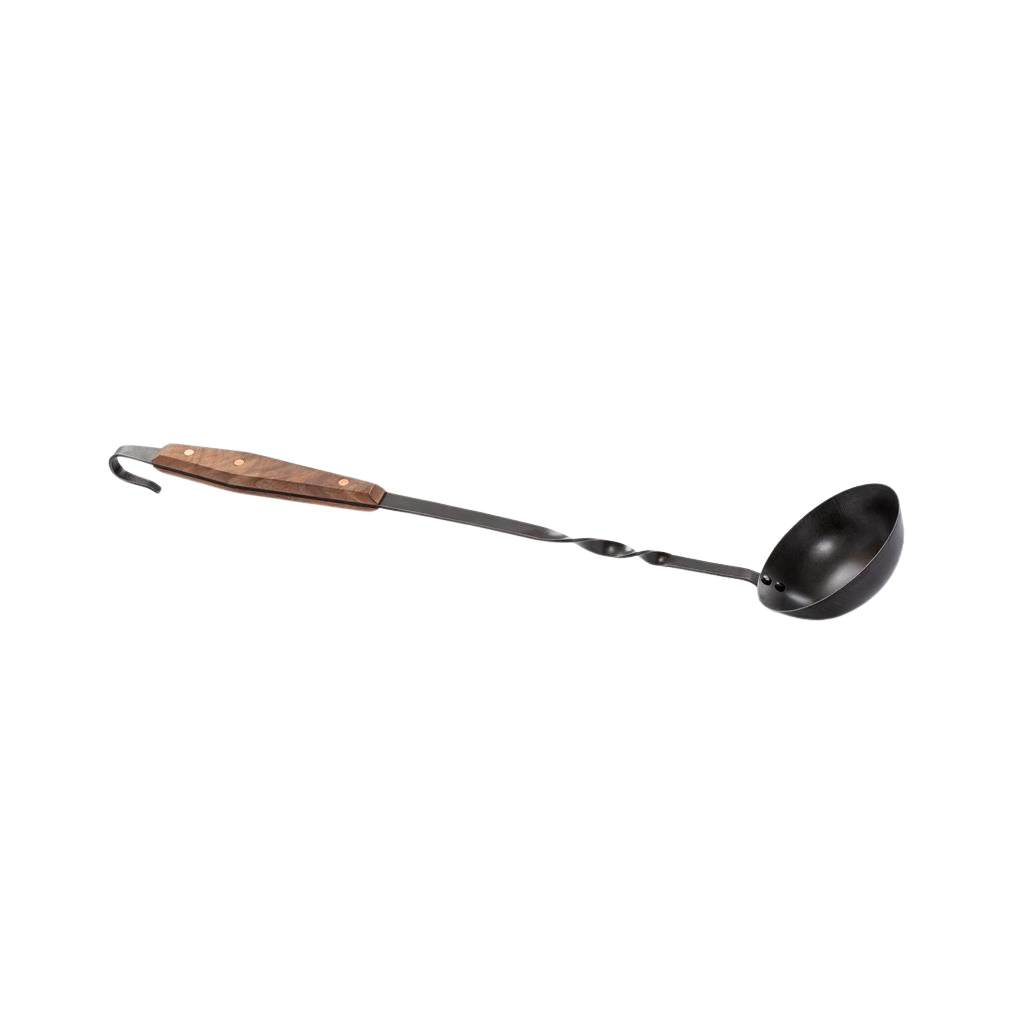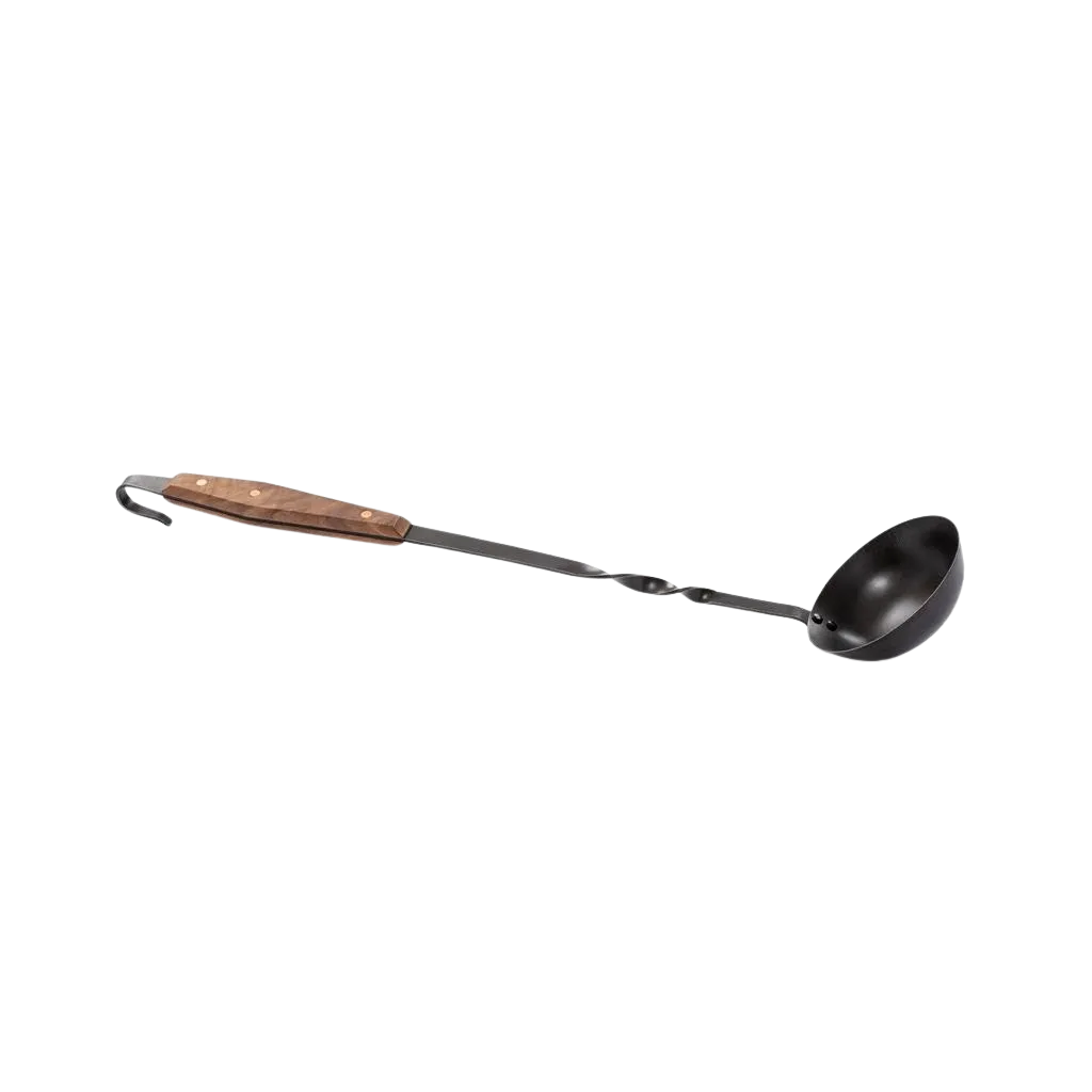 Налейте сосове, супи и яхнии с този единствен по рода си чирпак. Изработен е от ръчно изкована неръждаема стомана и е снабден с гладка, естествена орехова дръжка, която запазва хладно при висока температура. По-дългата от нормалната дължина позволява комфорт и безопасност при работа около огън и горещи въглища.