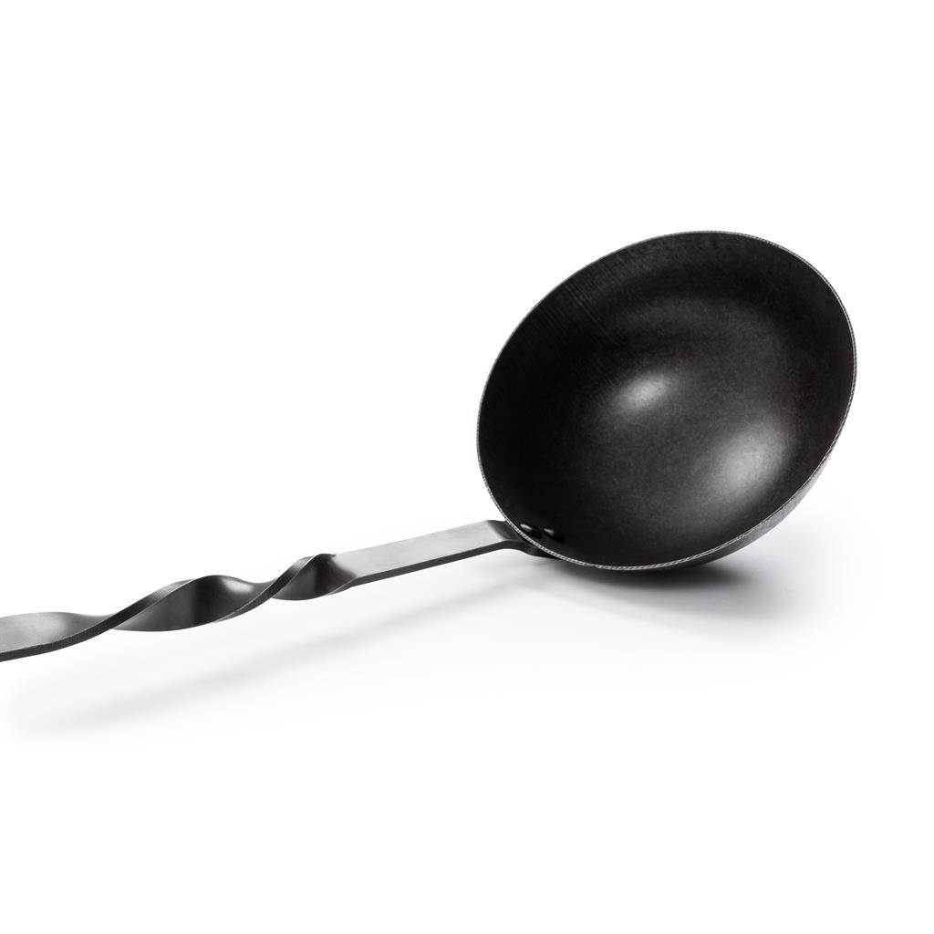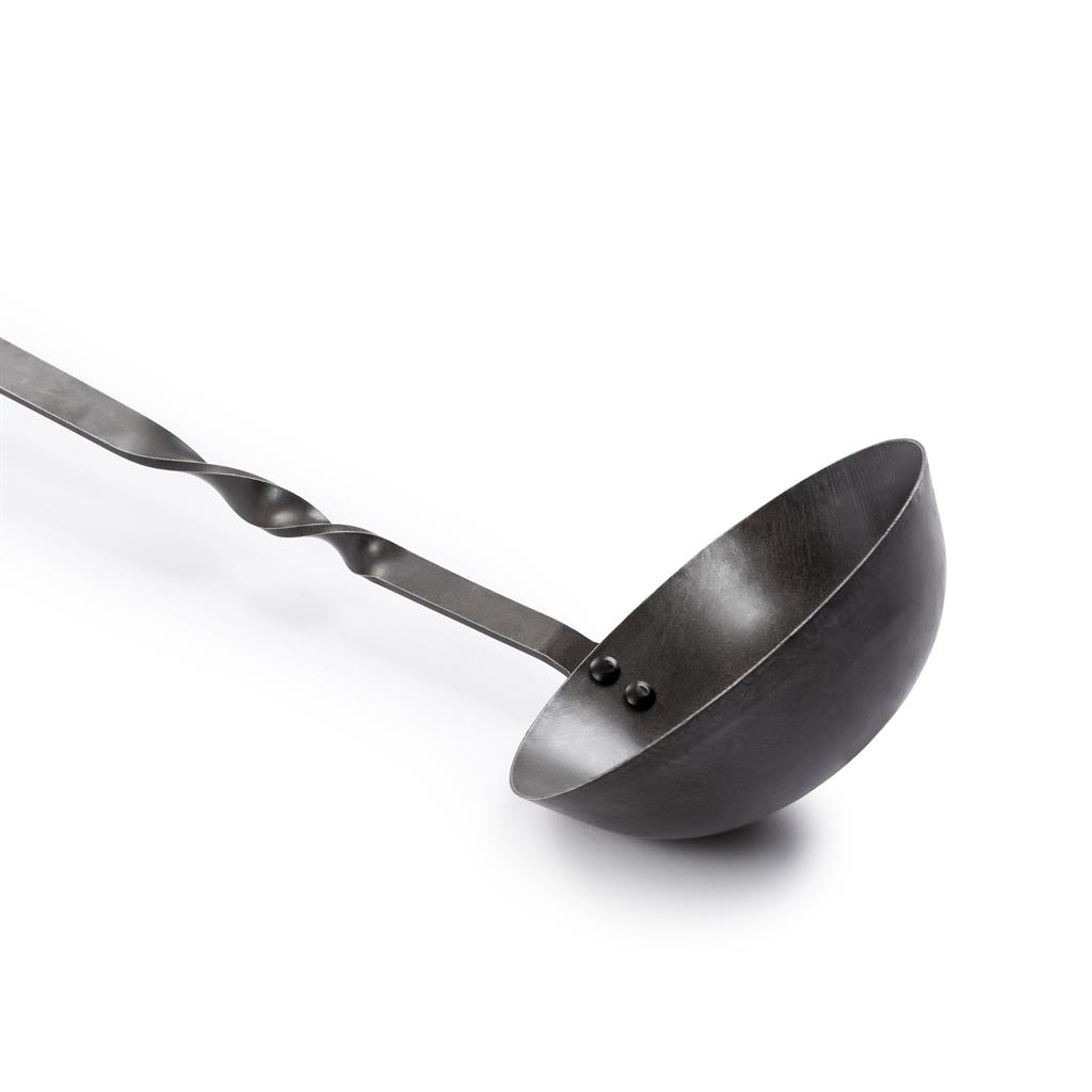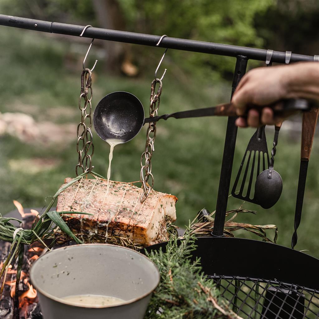 Налейте сосове, супи и яхнии с този единствен по рода си чирпак. Изработен е от ръчно изкована неръждаема стомана и е снабден с гладка, естествена орехова дръжка, която запазва хладно при висока температура. По-дългата от нормалната дължина позволява комфорт и безопасност при работа около огън и горещи въглища.