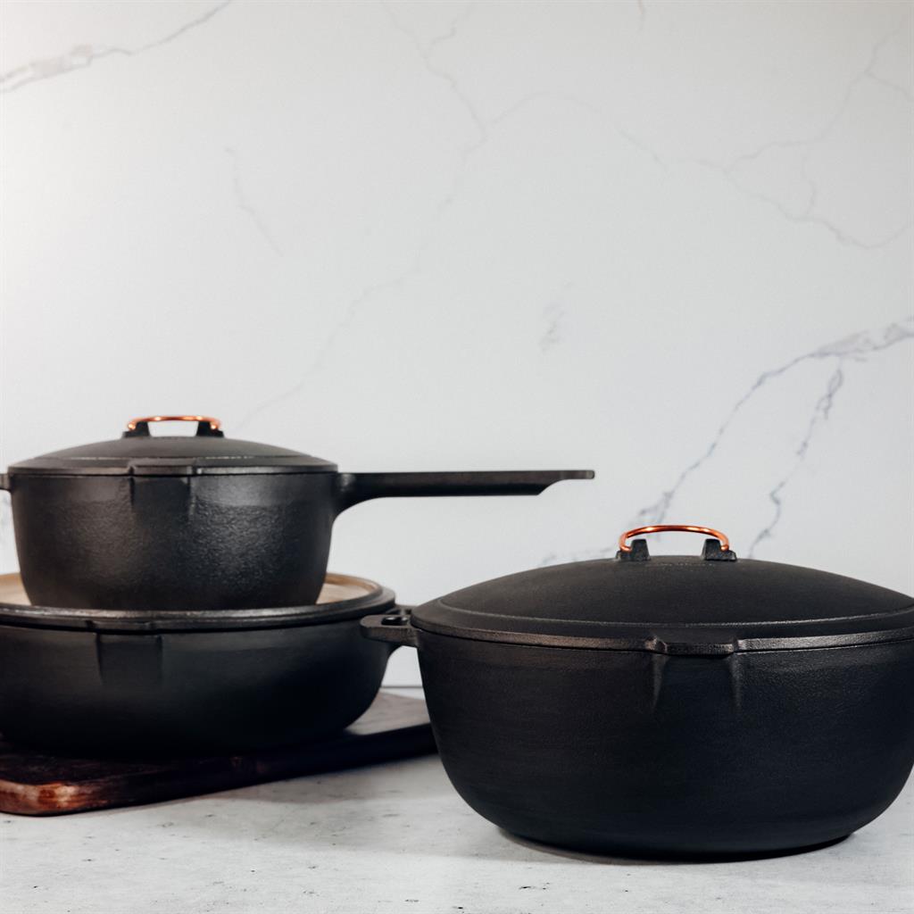 Гответе с лекотата на гладко, незалепващо емайлирано покритие, като същевременно се наслаждавате на изключителната здравина на суровия чугун от външната част на тенджерата. Лесно преминавайте от кухнята към барбекюто или направо на огъня и разширявайте готварските си умения с една завършена серия чугунени съдове.