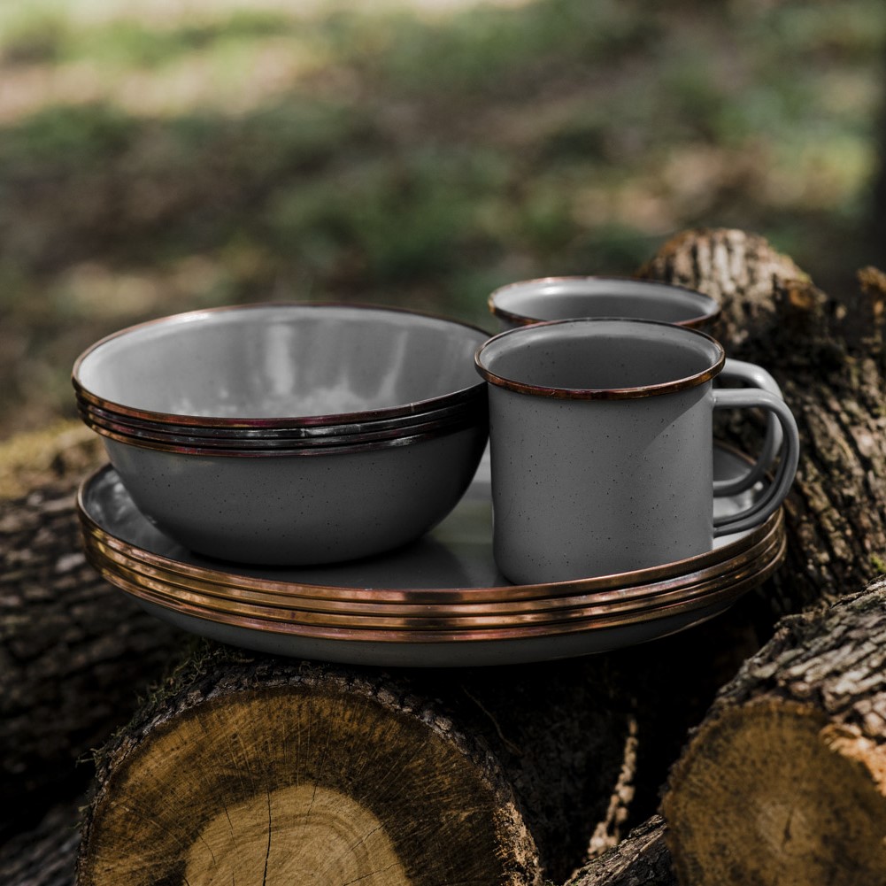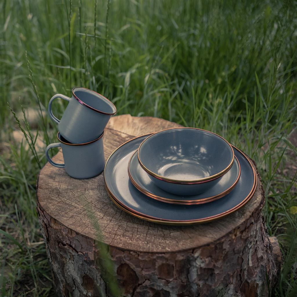 Емайлираните комплекти от съдове за хранене на BAREBONES са перфектни за създаване на запомнящи се преживявания, независимо дали се наслаждавате на небрежна почивка с чаша чай или организирате по-елегантно вечерно събиране на открито. Красивото съчетание от функционалност и стил прави съдовете идеален избор както за ежедневна употреба, така и за специални случаи. Всеки артикул разполага с ръчно завършен изпечен бронзов кант от неръждаема стомана, създаващ красив патиниран завършек.