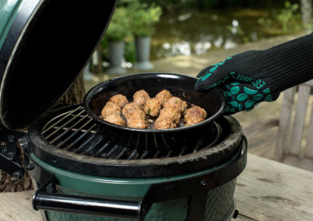 Кръглата тавичка за отцеждане на Big Green Egg събира мазнини, течности и други сокове, като не допуска те да изтичат върху дървените въглища или конвектора. Ако напълните кръглата алуминиева тавичка с малко вода, ще повишите влажността в Яйцето, което ще направи ястията ви по-сочни.