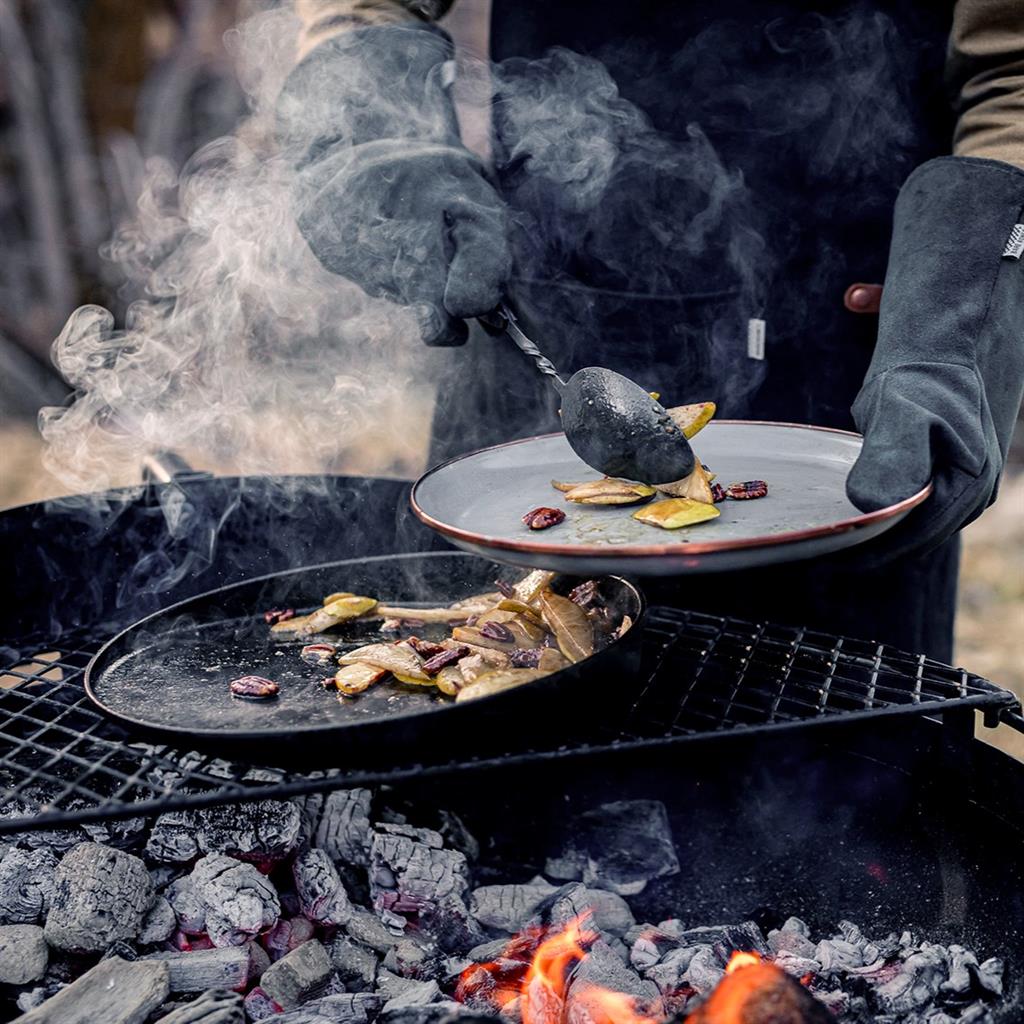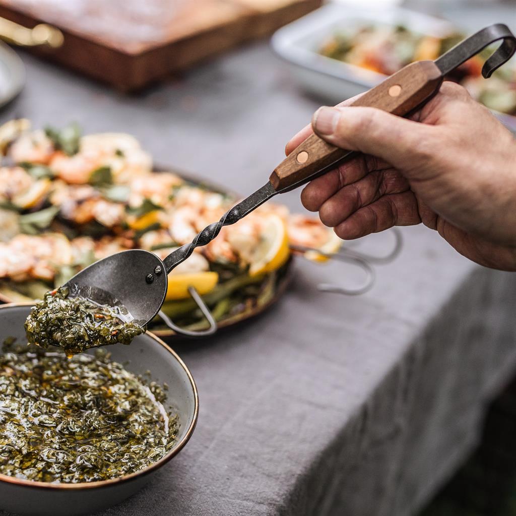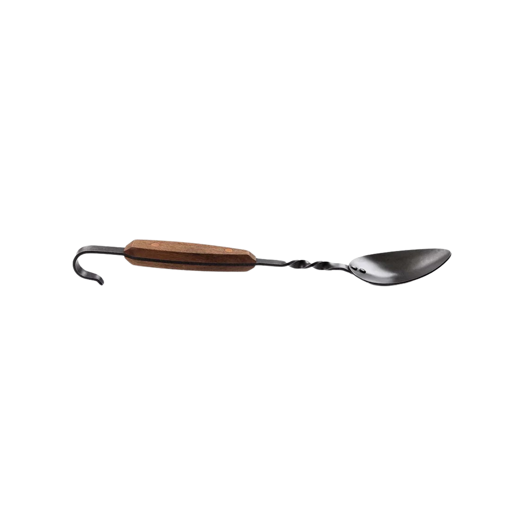 Отпийте, опитайте и разбъркайте с тази класическа готварска лъжица. Изработена е от ръчно изкована неръждаема стомана и е снабдена с гладка дръжка от естествен орех, която запазва хладно при висока температура. Проектирана за комфорт и безопасност при работа около огън и горещи въглища.