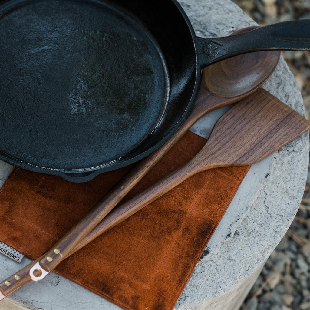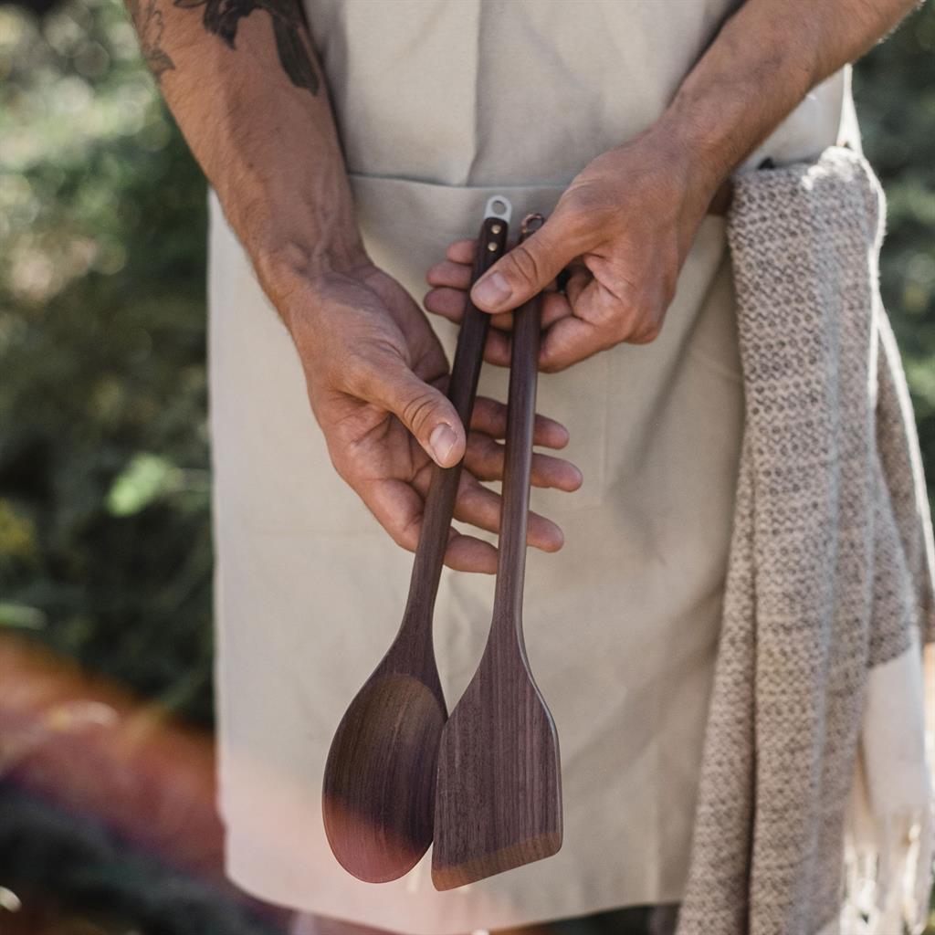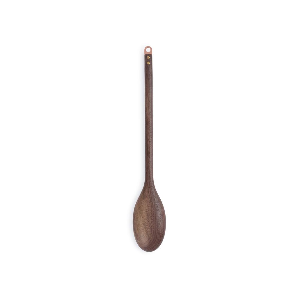 Преминете безпроблемно от подготовка в кухнята към готвене на открито с тази изящна лъжица от черен орех с медни акценти. Идеална за разбъркване на всяко ястие по време на готвене и за използване с чугунени и податливи на надраскване съдове.