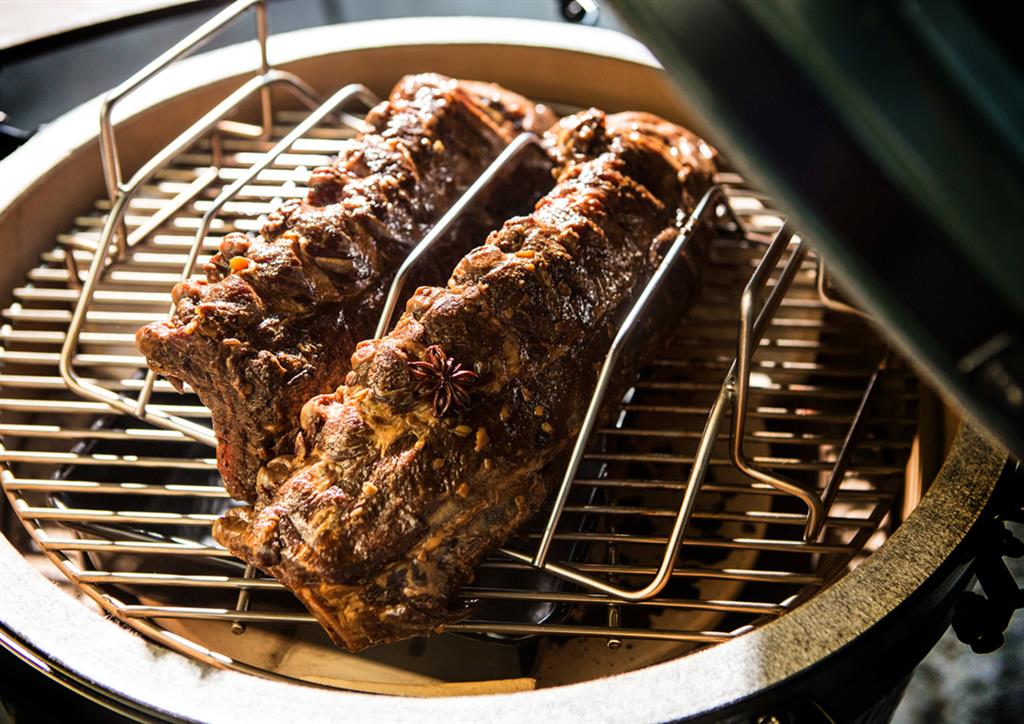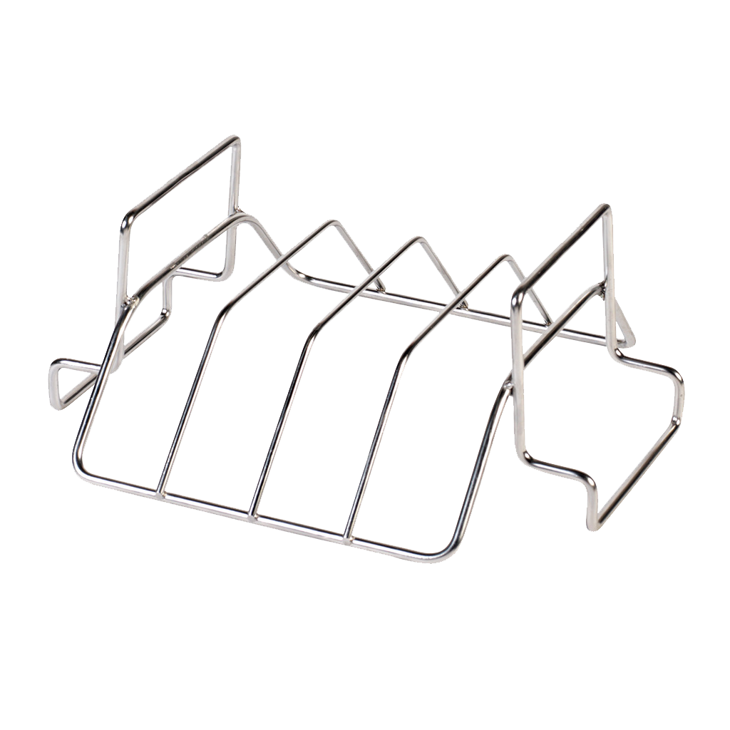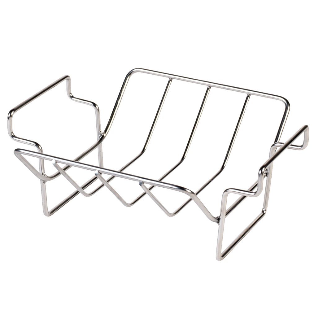 Тази многофункционална поставка за ребра и печене е идеална за готвене на големи парчета месо. В изправено положение представлява V-образна стойка, подходяща за големи парчета месо или (пълнени) птици, които трябва да се готвят бавно. Когато я обърнете обратно, тя се превръща в стойка за приготвяне на ребърца. Това, което дава отлични резултати, е постоянният въздушен поток около поставката. Абсолютна необходимост за месоядните!